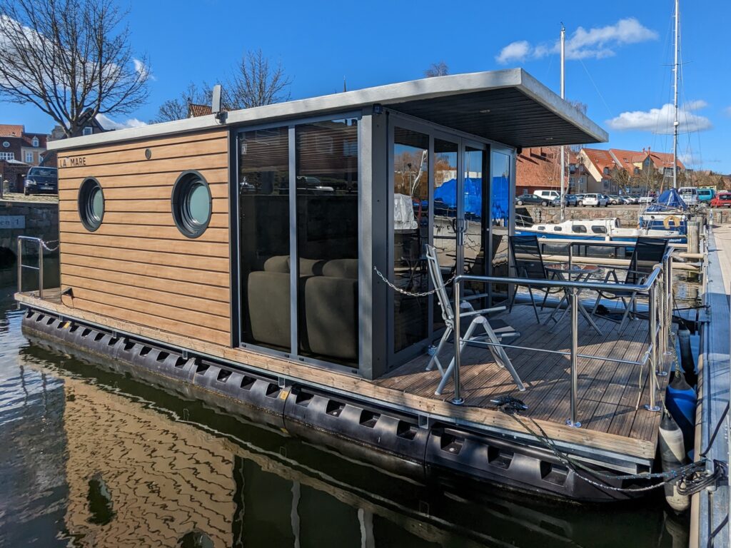 Die schwimmende Ferienwohnung liegt mitten in Stralsund in geschützter Lage im Langenkanal.